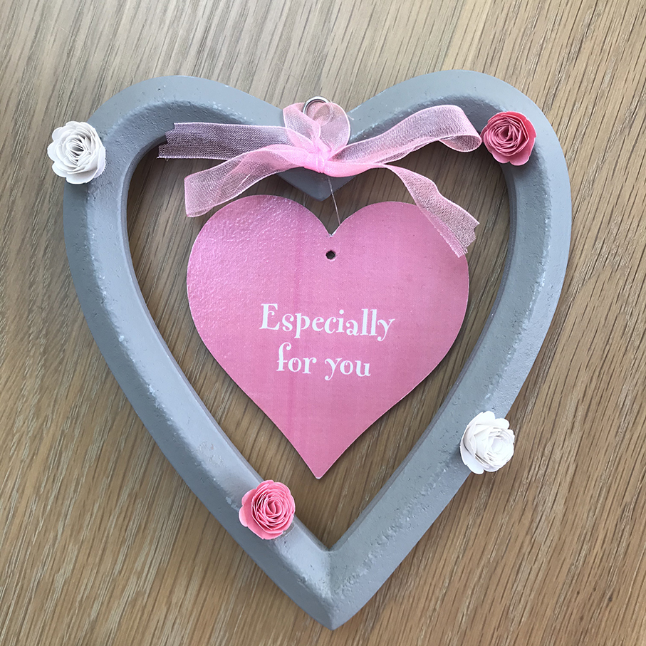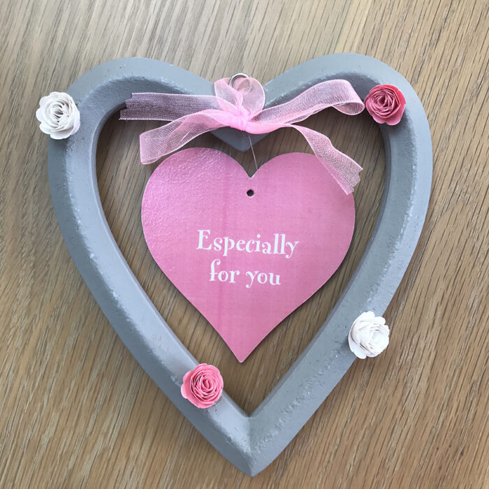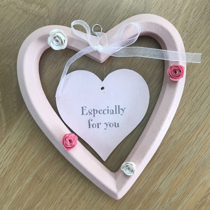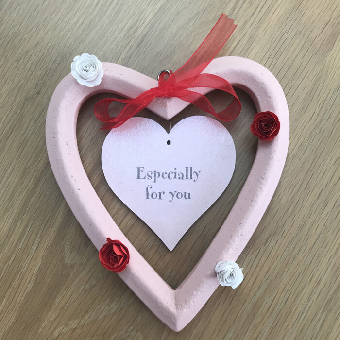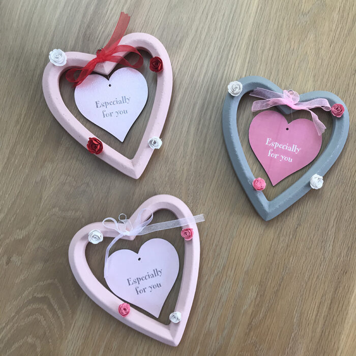 Lovely hand decorated open wooden hearts. Approx 6″. All slightly different due to the handcrafted nature. Text: “Especially for you” on a middle hanging wooden heart. Limited stock. Perfect gift for someone special. Choice of colours, enquire for availability.