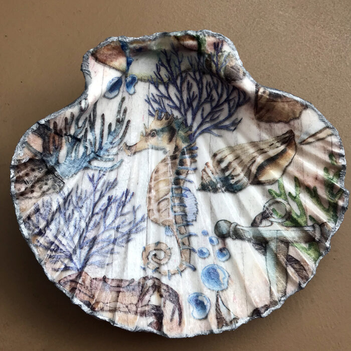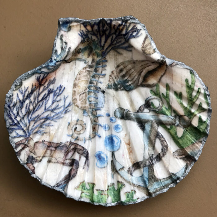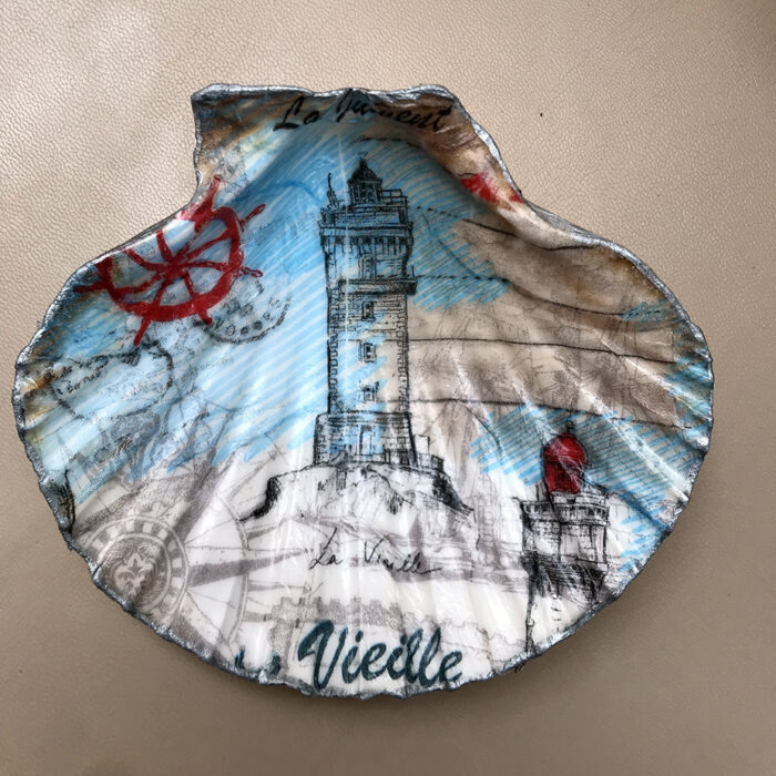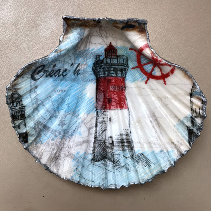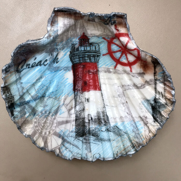 Decoupaged scallop shell trinket dishes. Choice of 2 designs – seashore or lighthouse.