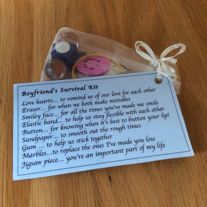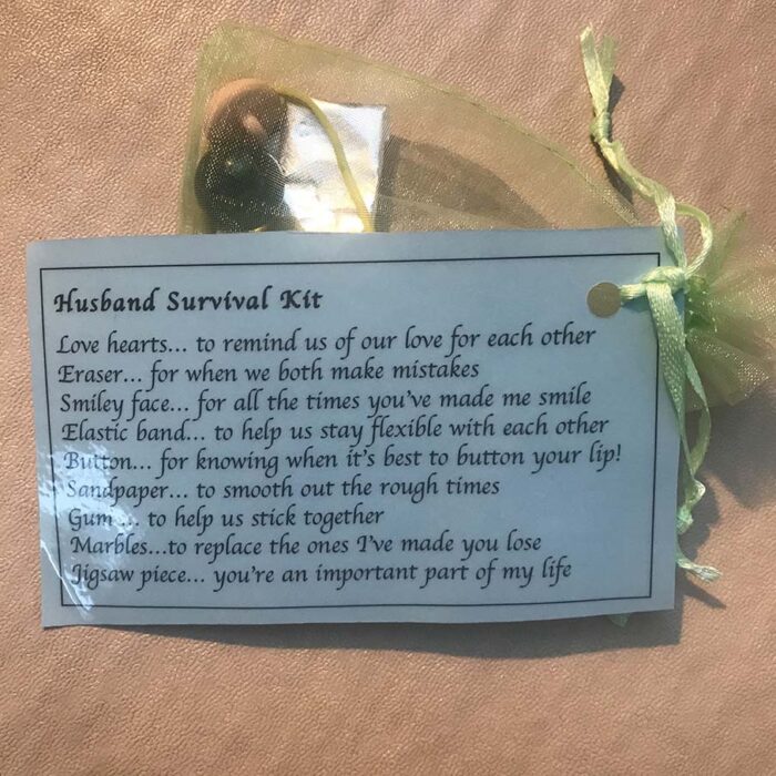Looking for an unusual gift for a family member or friend? How about one of our very popular novelty Survival kits. Cheaper than a lot of cards we have something to suit nearly every occasion! A little organza bag contains the items listed on the laminated label with a special significance for each item. Surprise someone special with our unusual and thoughtful Survival Kits, filled with everything they will need to “survive” their special occasion.